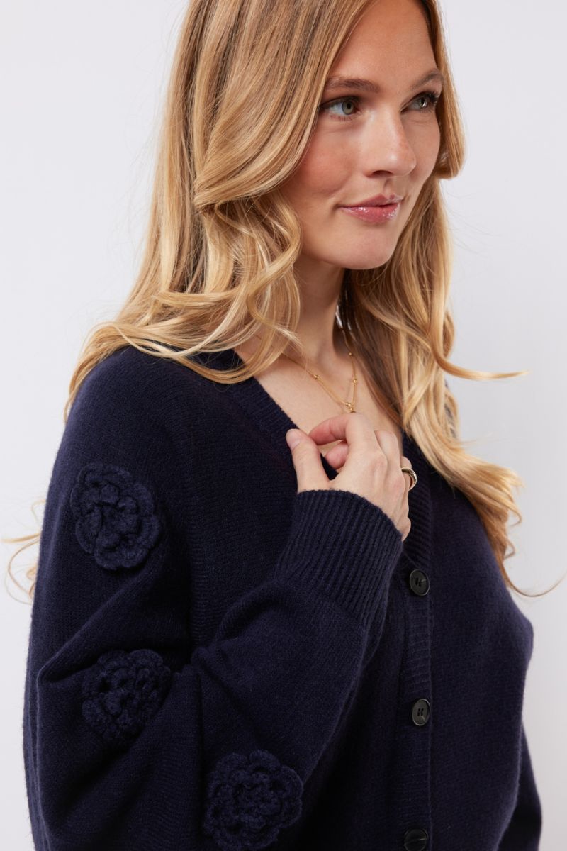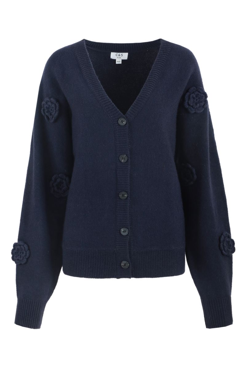 C&S The Label Chloe Knit Cardigan Midnight Blue is een charmant en vrouwelijk vest dat elke outfit een elegante touch geeft. De gehaakte bloemenapplicaties op de mouwen zorgen voor een speels en verfijnd detail.