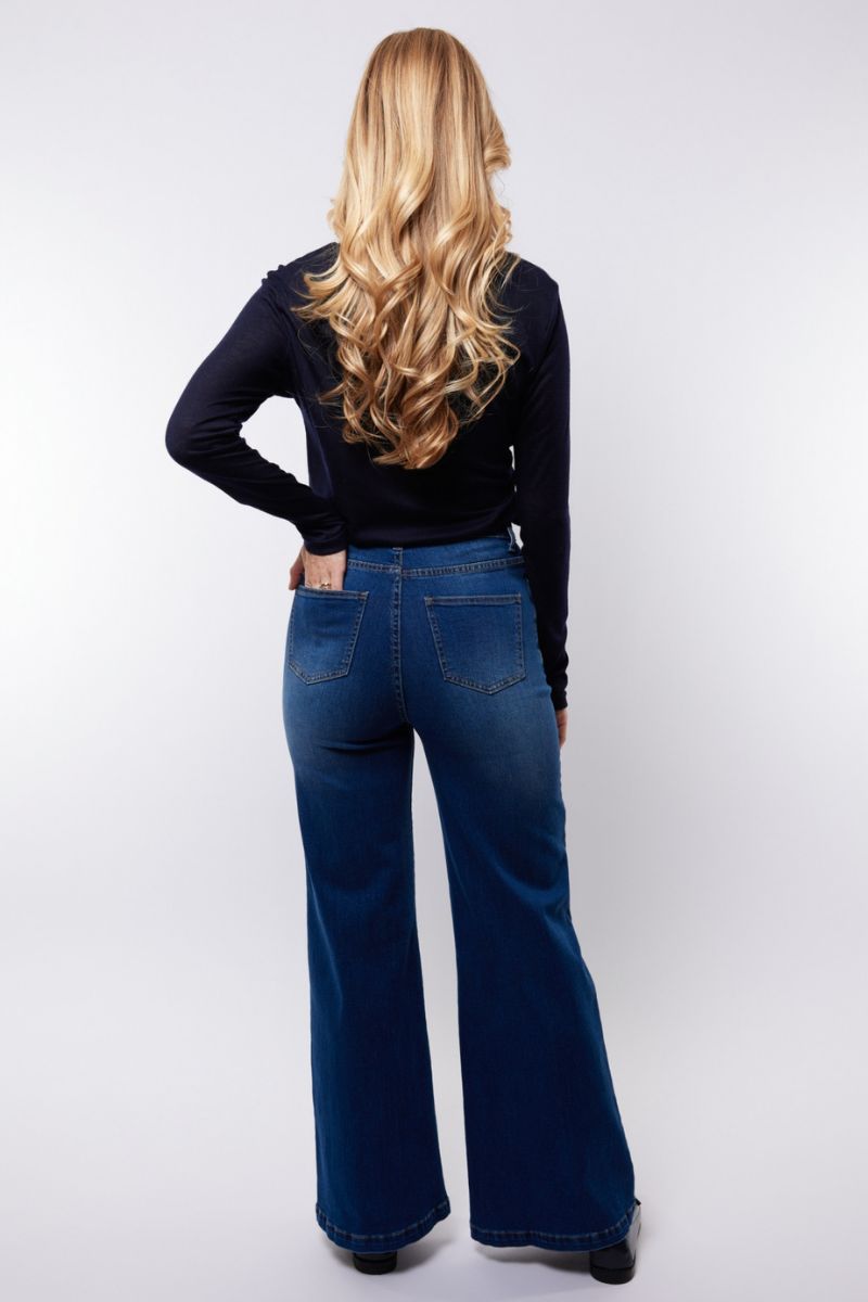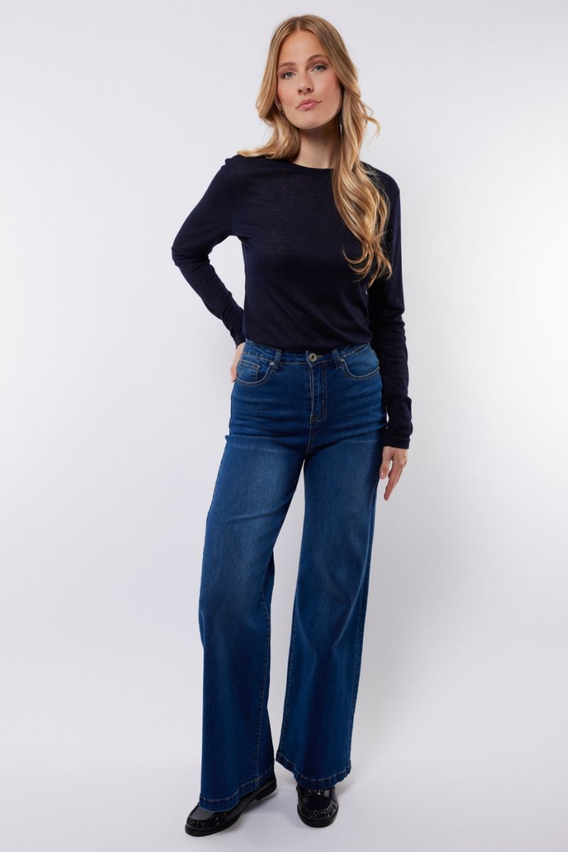 De donkerblauwe denimwassing en de cleane afwerking geven de broek een tijdloze uitstraling, waardoor ze eindeloos te combineren is. Of je nu kiest voor een casual outfit met sneakers of een geklede look met hakken, de Nicole jeans biedt altijd de juiste basis.