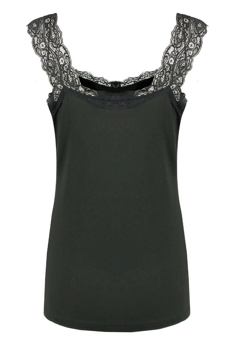C&S The Label Trijn Singlet Zwart is een vrouwelijke, mouwloze top in de kleur zwart. Het topje is voorzien van kanten schouderbandjes.