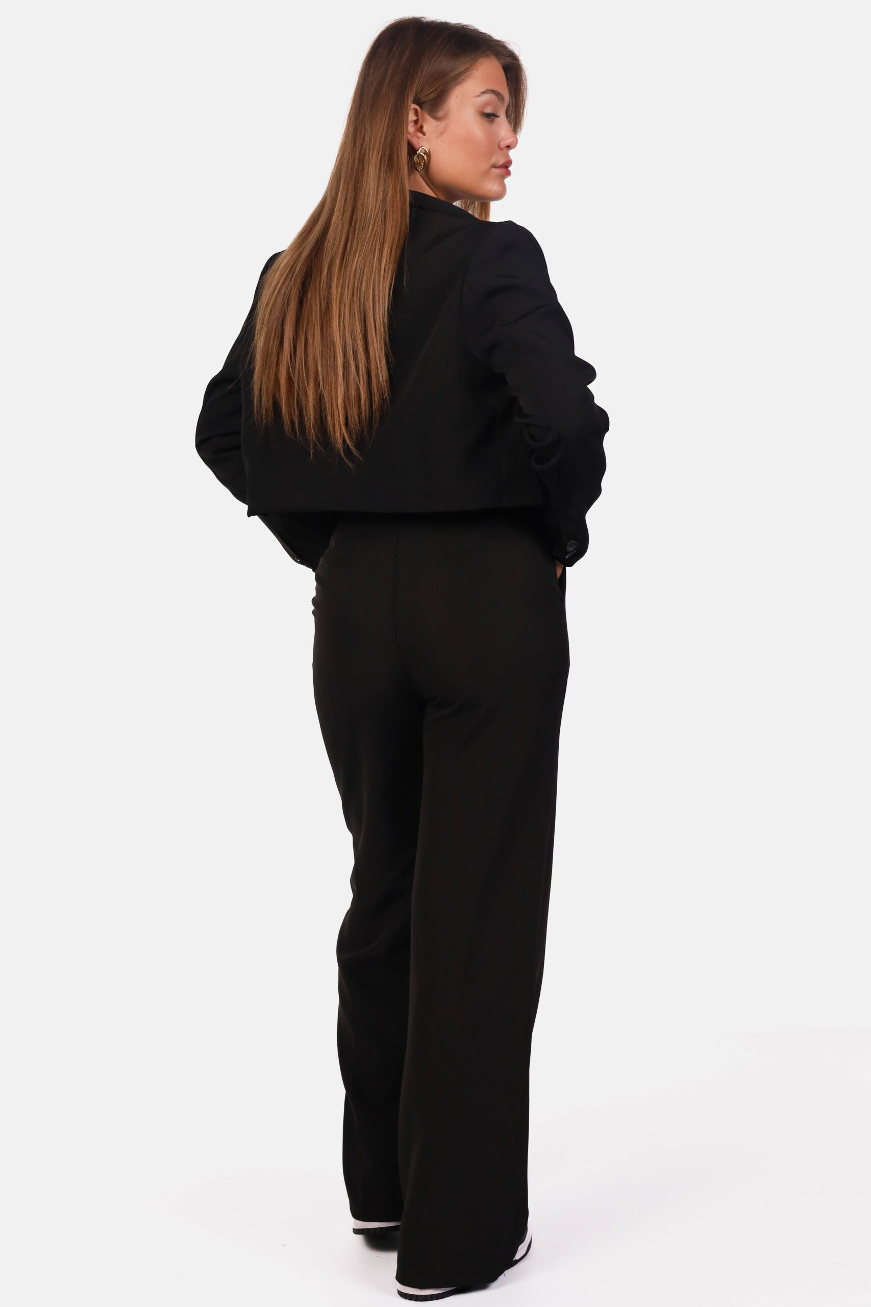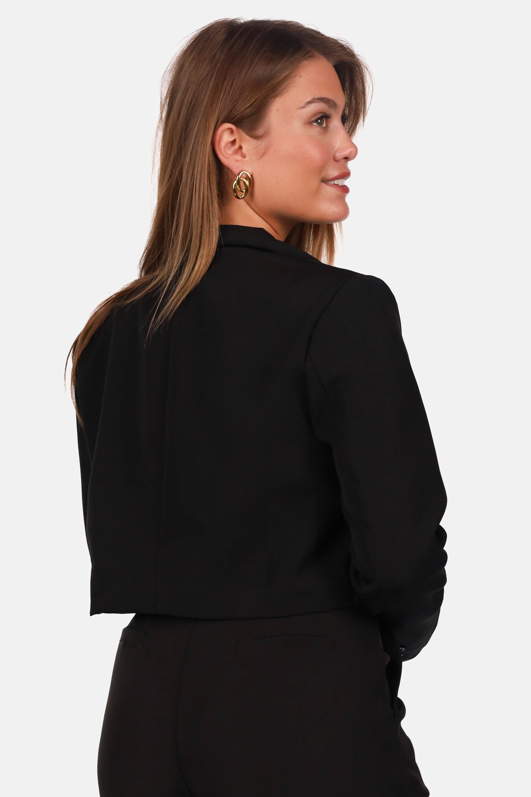 Deze korte blazer met moderne pasvorm is een stijlvol statementstuk dat moeiteloos elegantie en power combineert. De korte lengte geeft een eigentijdse uitstraling, terwijl het cleane design en de rechte schouders zorgen voor een strakke, moderne look. De blazer sluit met één knoop en valt mooi recht, waardoor hij een perfecte balans biedt tussen klassiek en trendy. De licht elastische stof voelt stevig en glad aan, met voldoende stretch voor optimaal draagcomfort. De korte snit benadrukt de taille en is ideaal te combineren met een high waist pantalon of rok. Dankzij de tijdloze kleur en minimalistische afwerking kun je deze blazer zowel zakelijk als casual dragen, van kantoor tot avondje uit. Draag hem als set met de bijpassende pantalon uit dezelfde Getdrezzed-collectie voor een gecoördineerde, moderne look. Ook mooi over een top of blouse voor een gestroomlijnde outfit die moeiteloos stijl en klasse uitstraalt.