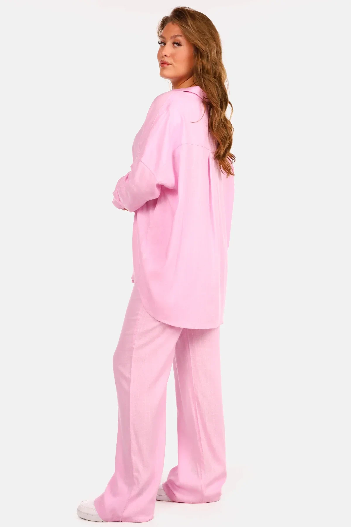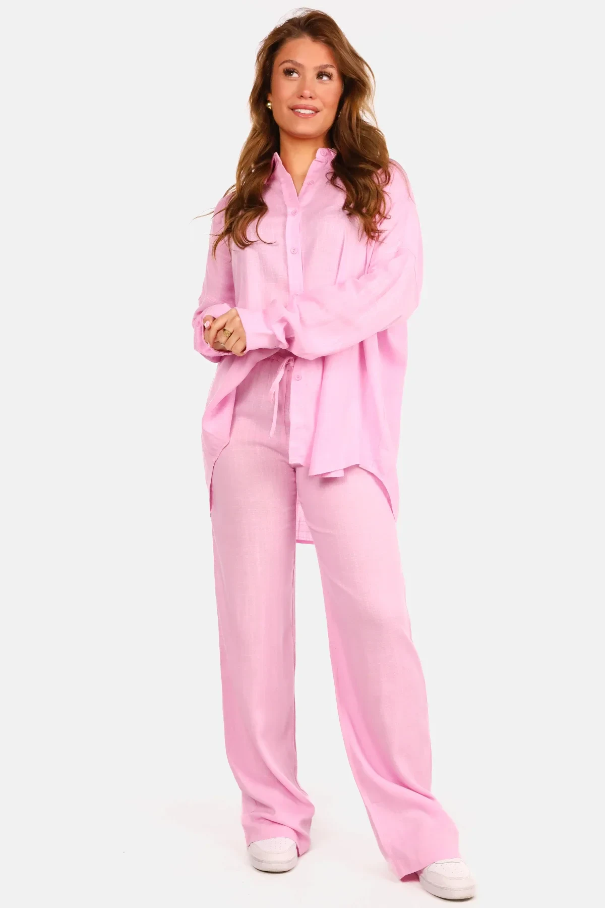 Deze linnen wide leg broek is de perfecte mix van comfort en stijl. Dankzij de luchtige stof en de losvallende pasvorm biedt deze broek ultiem draagcomfort zonder in te leveren op elegantie. De elastische tailleband met trekkoord zorgt voor een flexibele pasvorm, terwijl de vloeiende wijde pijpen een moeiteloos chique uitstraling geven. De broek is veelzijdig te combineren en past zich moeiteloos aan verschillende stijlen aan. Draag hem casual met een basic top en sneakers of creëer een verfijnde look door hem te combineren met een blouse en sandalen. Wil je een complete en trendy set? Style deze broek dan met de bijpassende oversized linnen blouse voor een stijlvolle en samenhangende outfit. Of je nu op zoek bent naar een comfortabele everyday look of een zomerse, elegante outfit, deze broek is een tijdloos item dat je eindeloos kunt blijven dragen.