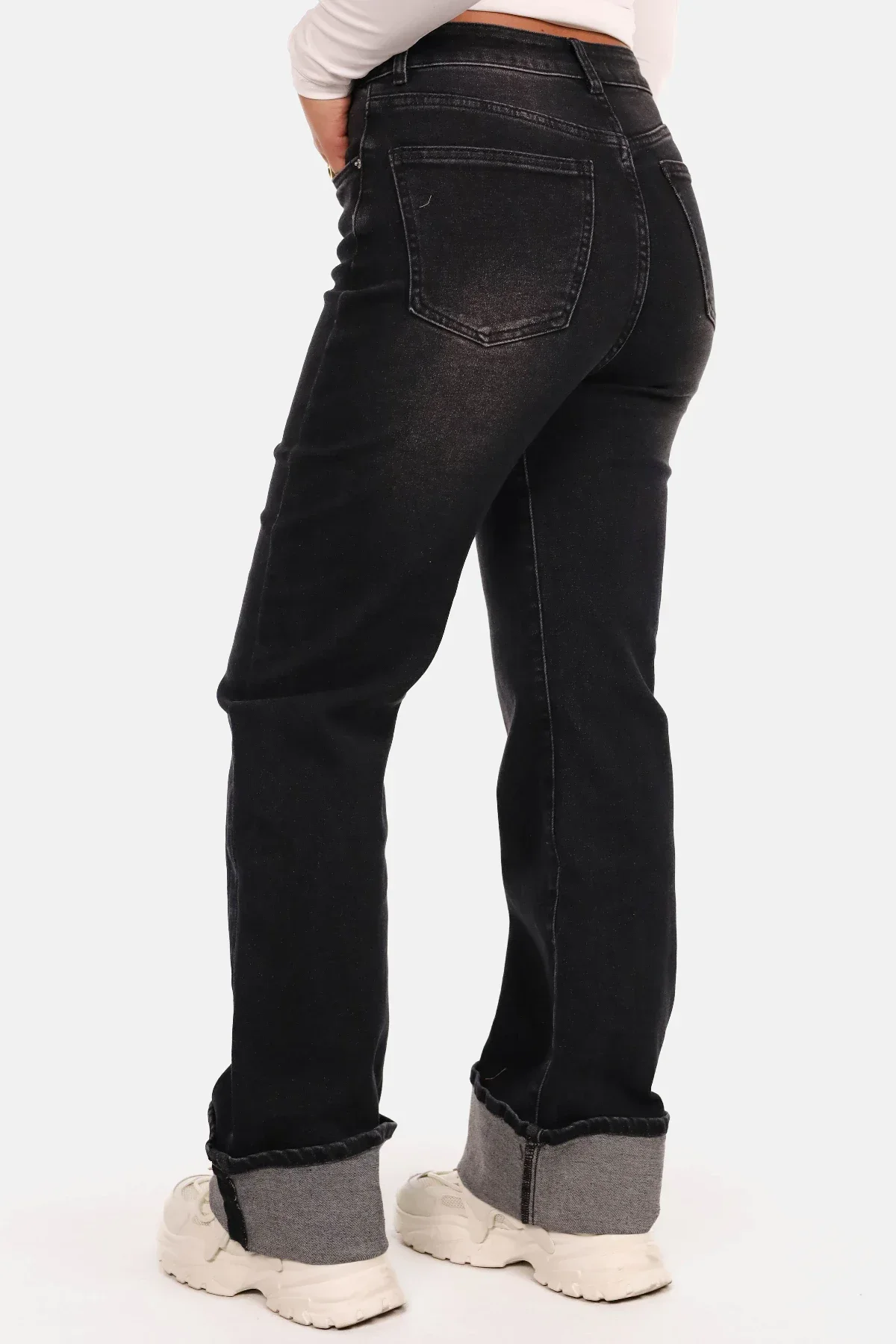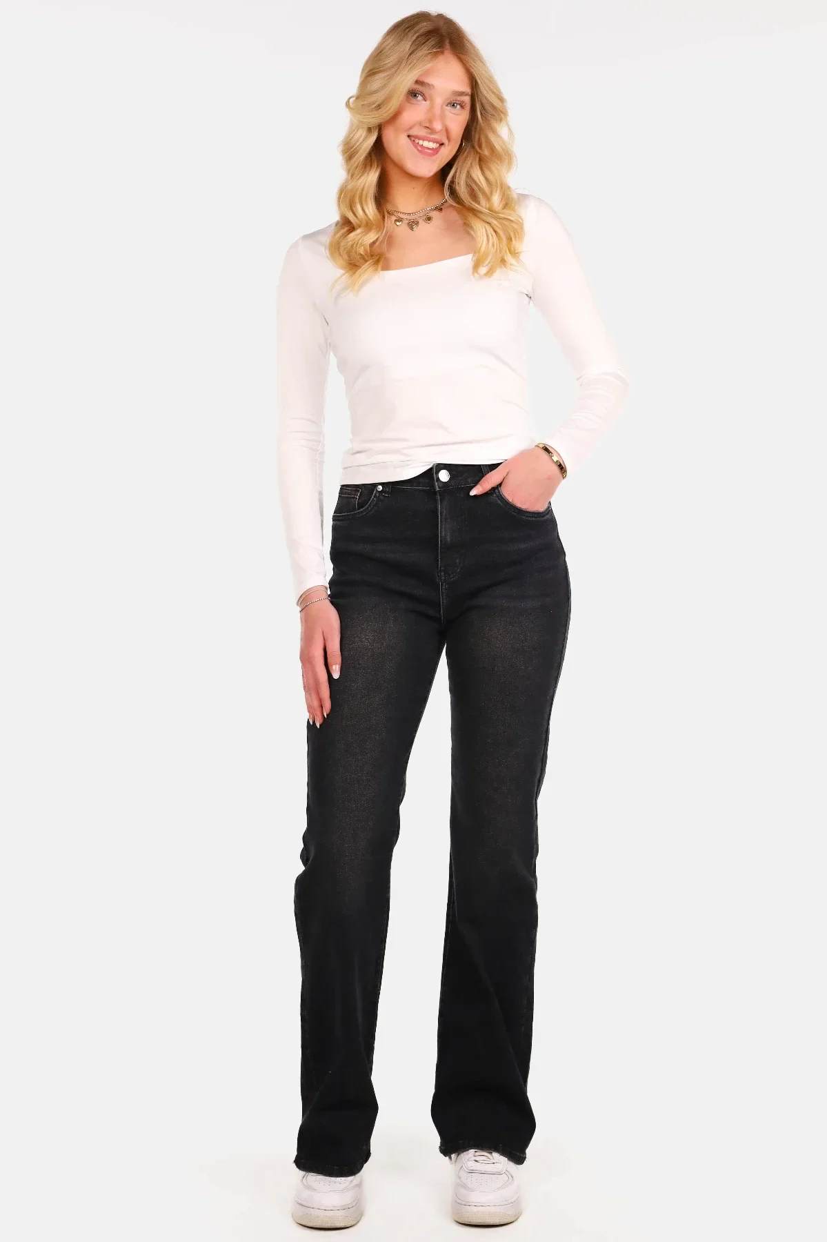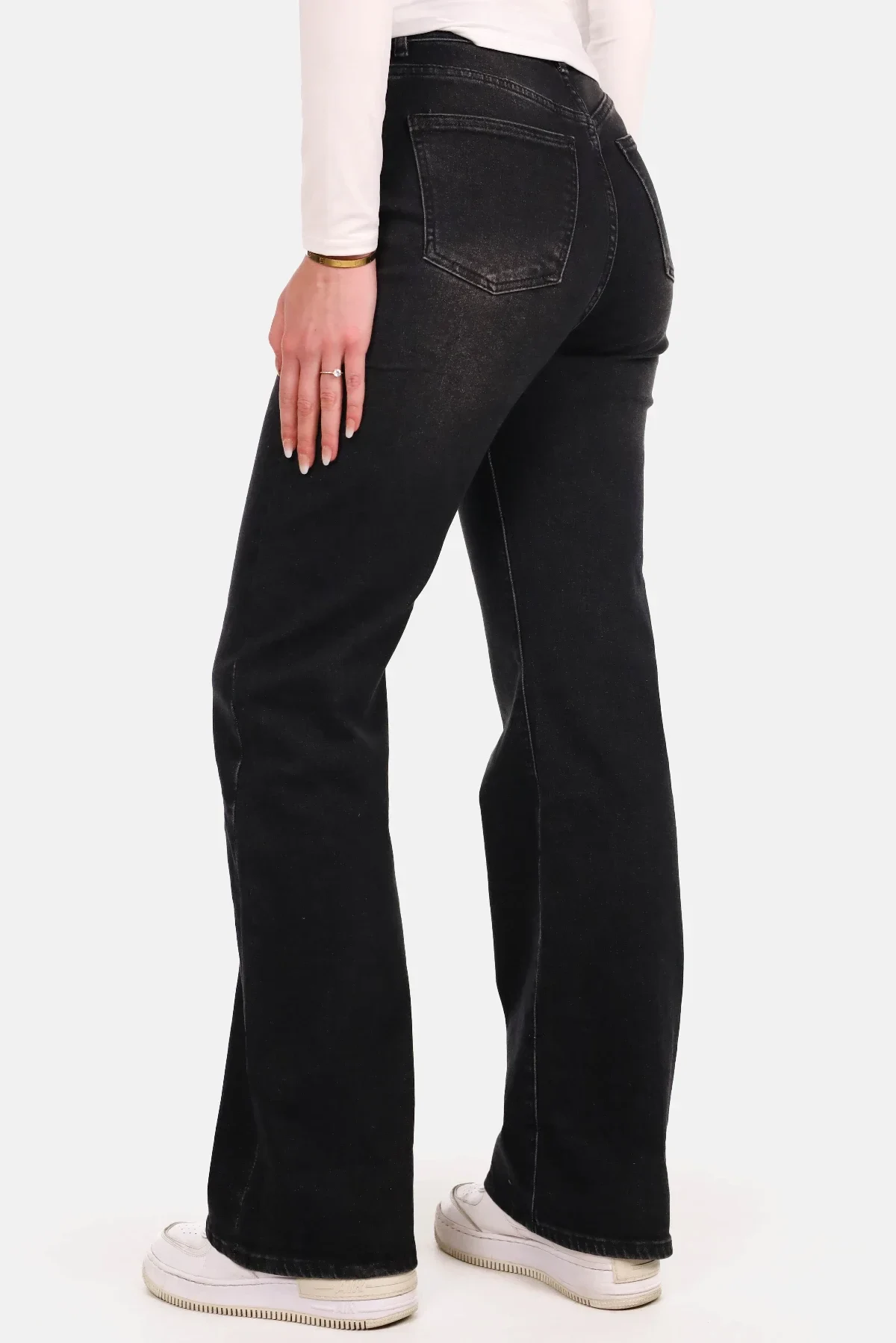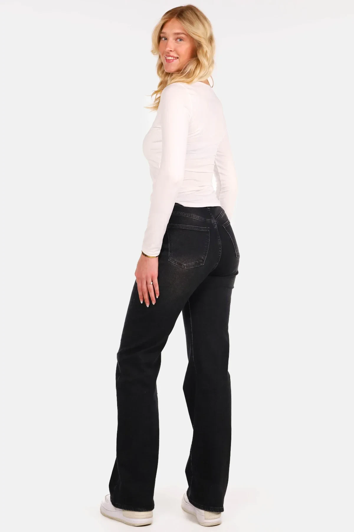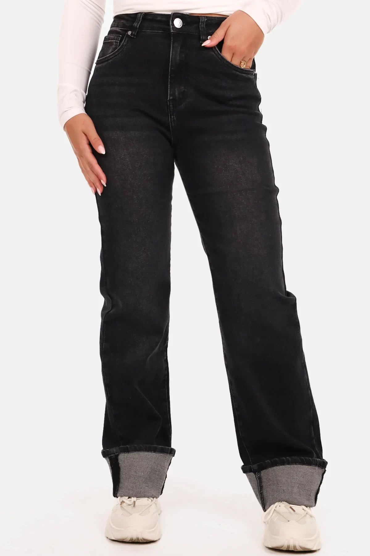 Deze wide leg jeans combineert een stoere uitstraling met een slimme twist. De pijpen hebben een omgeslagen zoom die dichtgestikt is, maar eenvoudig los te maken is met een tornmesje. Als je de zoom losknipt, wordt de broek ongeveer 10 centimeter langer – ideaal voor wie graag extra lengte wil zonder concessies te doen aan de stijl. Zo kies je zelf of je gaat voor een opgerolde look of juist voor een langere, uitgesproken silhouet. De hoge taille zorgt voor een mooi aansluitende fit in de taille, wat een flatterend effect geeft. De stevige denim met subtiele wassing voelt comfortabel aan en behoudt zijn vorm gedurende de dag. Dankzij de rechte, wijde pijpen en klassieke vijfzakkenstijl is dit een veelzijdige jeans die moeiteloos combineert met zowel casual als gekledere outfits. Denk aan een cropped trui of een blouse voor een stijlvolle balans tussen nonchalant en chic.